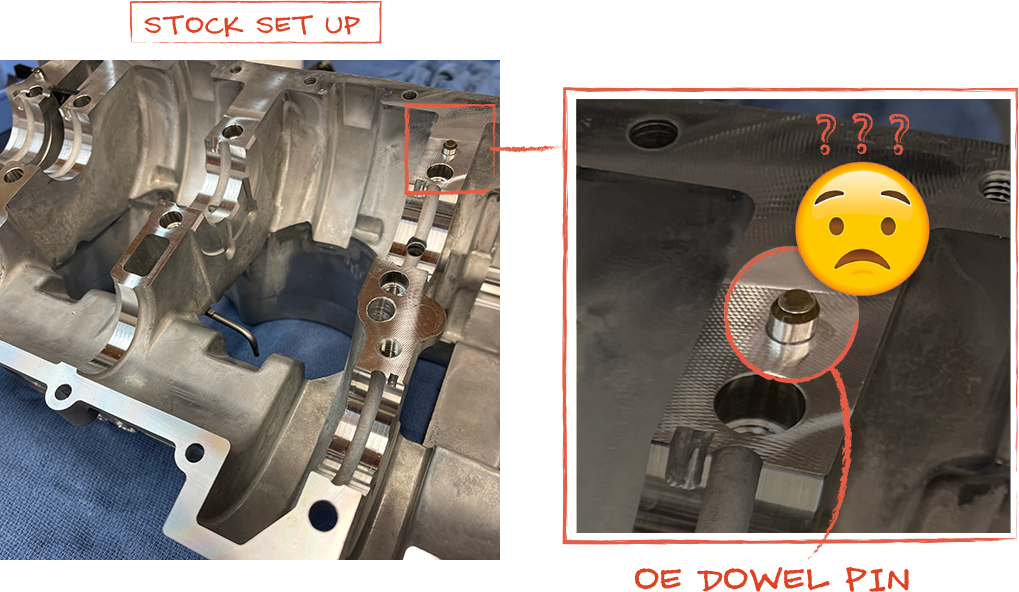 really.... thats it? The Polaris OE factory crankcase only incorporates two small dowel pins to align the entire case halves. This is sufficient for factory main studs, where the torque specs are 21 ft lbs. However if you want to utilize the ARP2000 main studs, with a torque spec of 60 ft lbs, these two pins cannot accommodate the load created by the increased torque, allowing the two case halves to shift by as much as .010". This allows oil to hemorrhage out the lower half, losing oil pressure up to the rods and even the cylinder head, cams and lifter buckets.